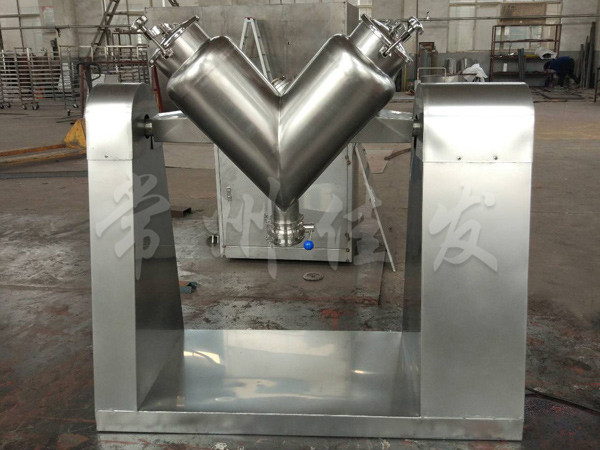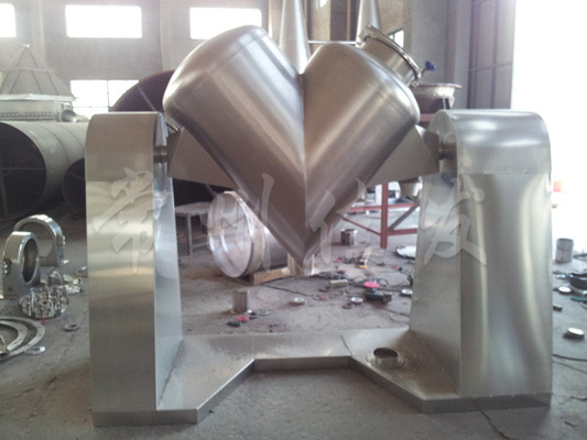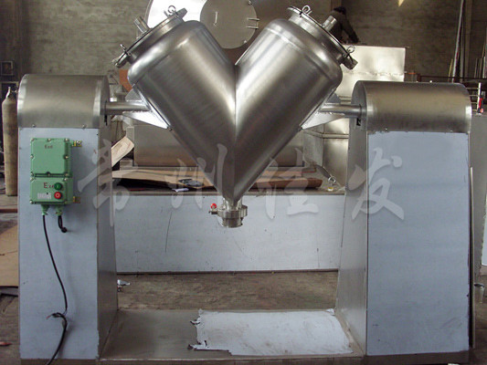 該機通過機械傳動,使不對稱的V型圓柱體內(nèi)的物料做往復翻動,達到均勻混合之目的。